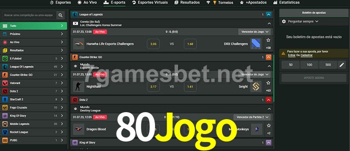 O 80Jogo oferece uma grande seleção de opções de apostas em e-sports com probabilidades competitivas